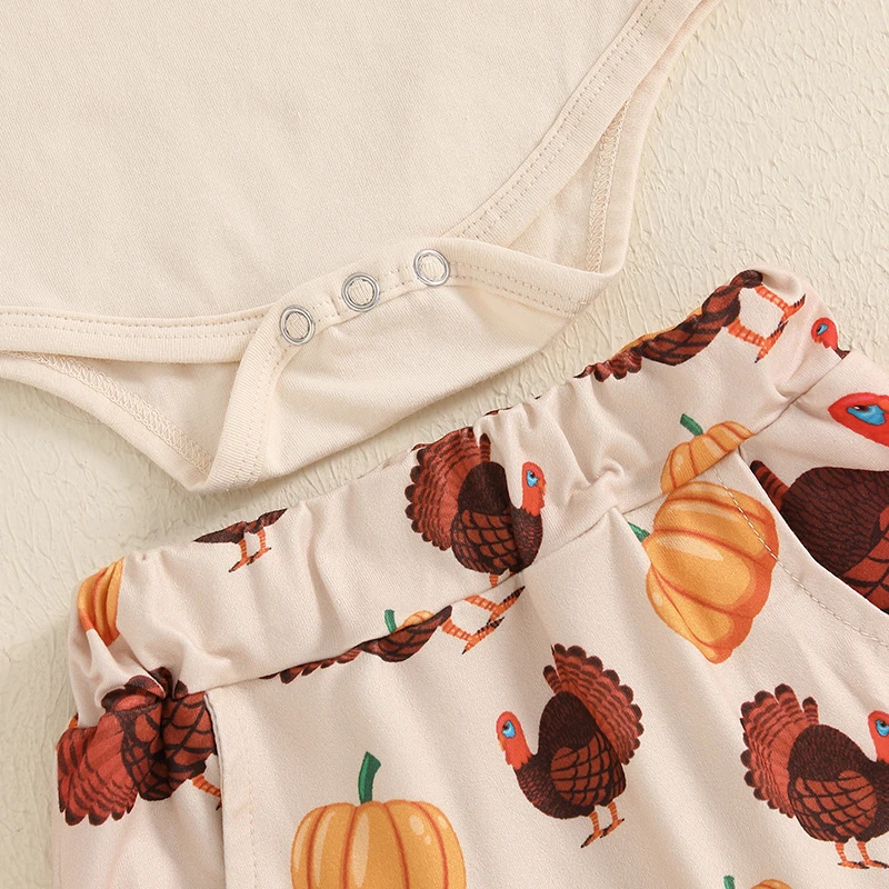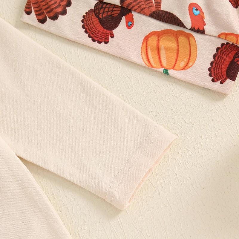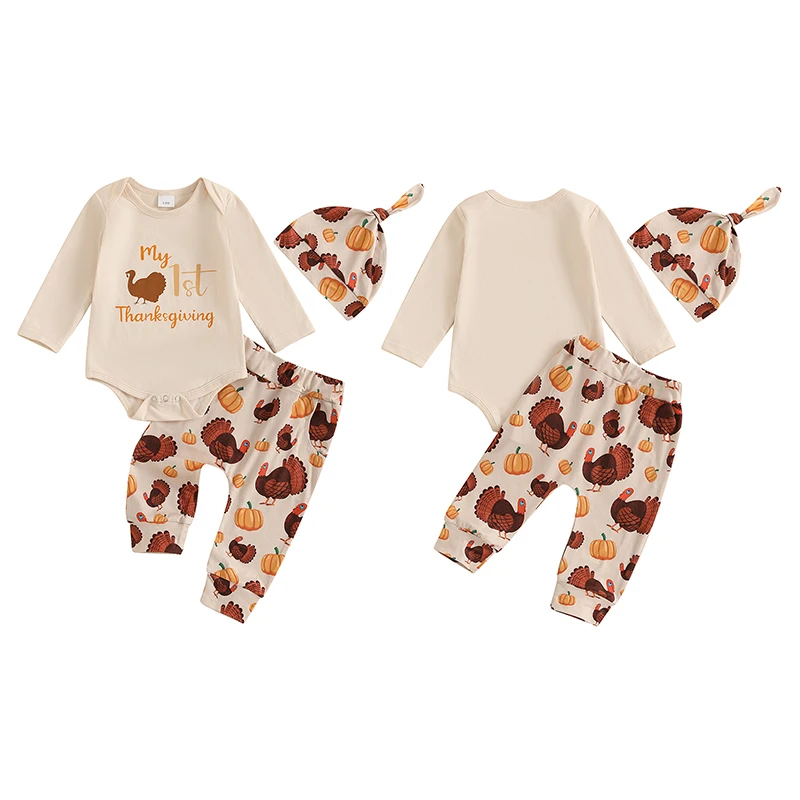 Baby First Thanksgiving Outfits Letter Print Long Sleeve Romper with Turkey Pattern Pants and Hat 3 Pcs Set
