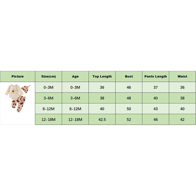 3-6MTops Length: 14.96 Bust: 18.9Pants Length: 15.75 Waist: 14.96Advised Age: 3-6 Months