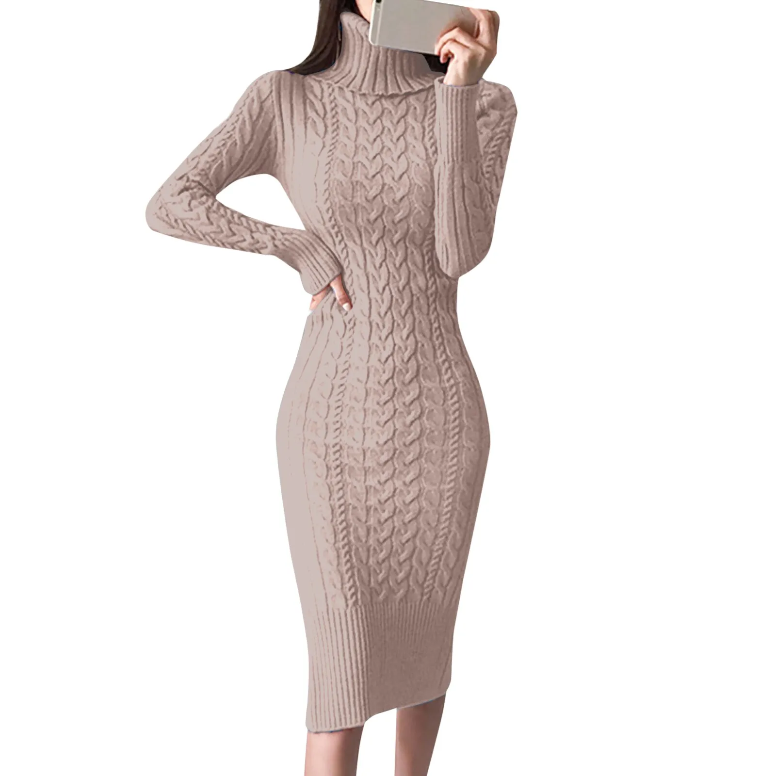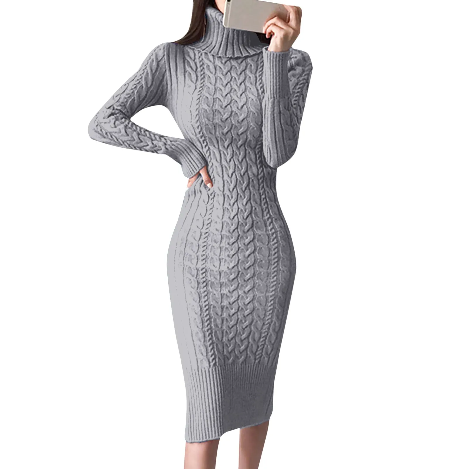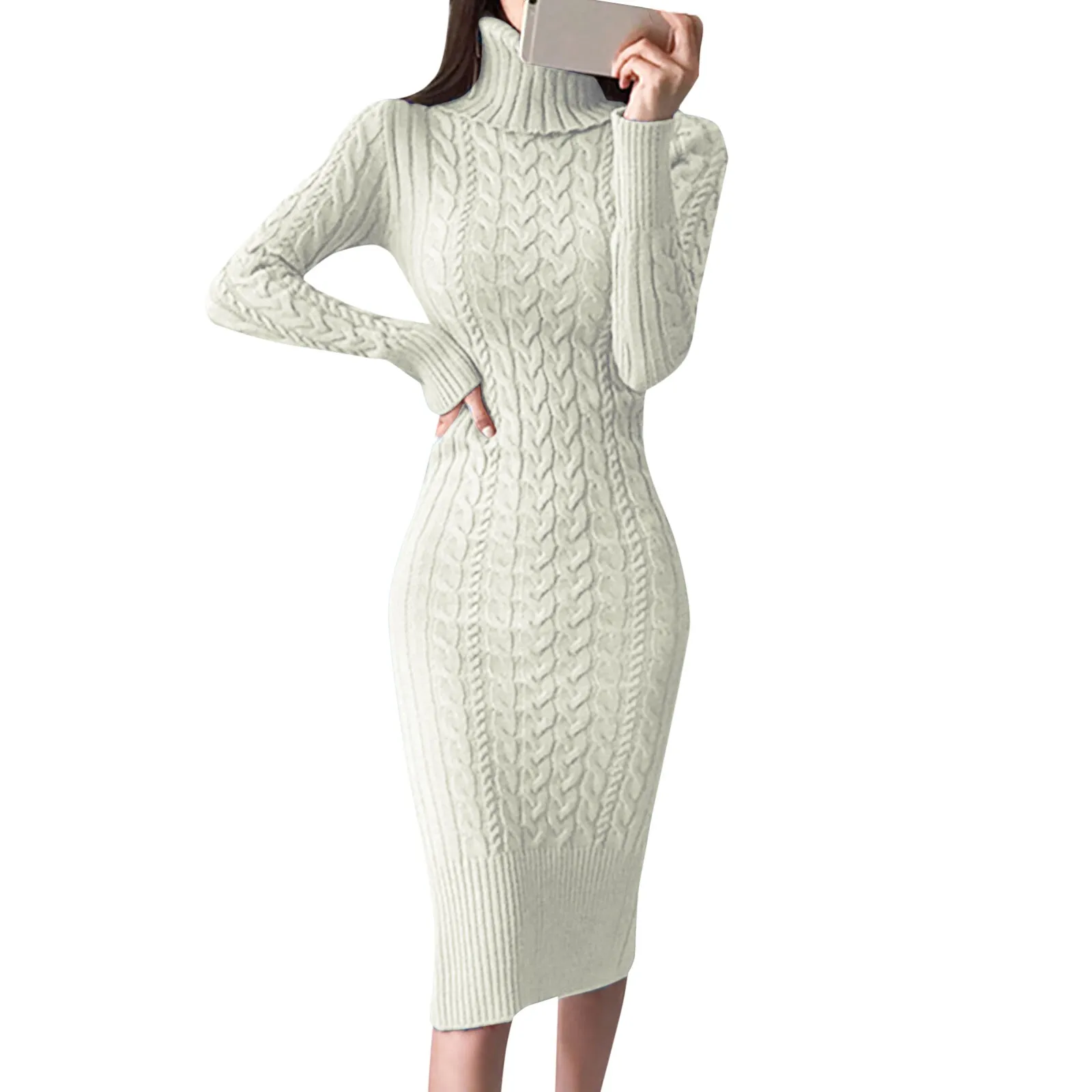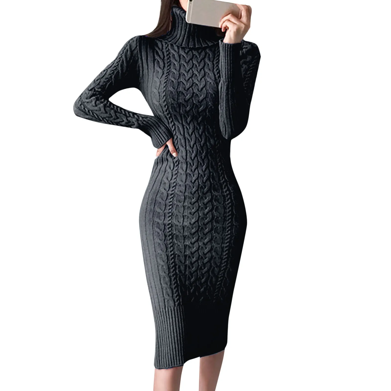 Womens Long Sleeve Turtleneck Sweater Dresses Knitted Bodycon Midi Jumper Dresses