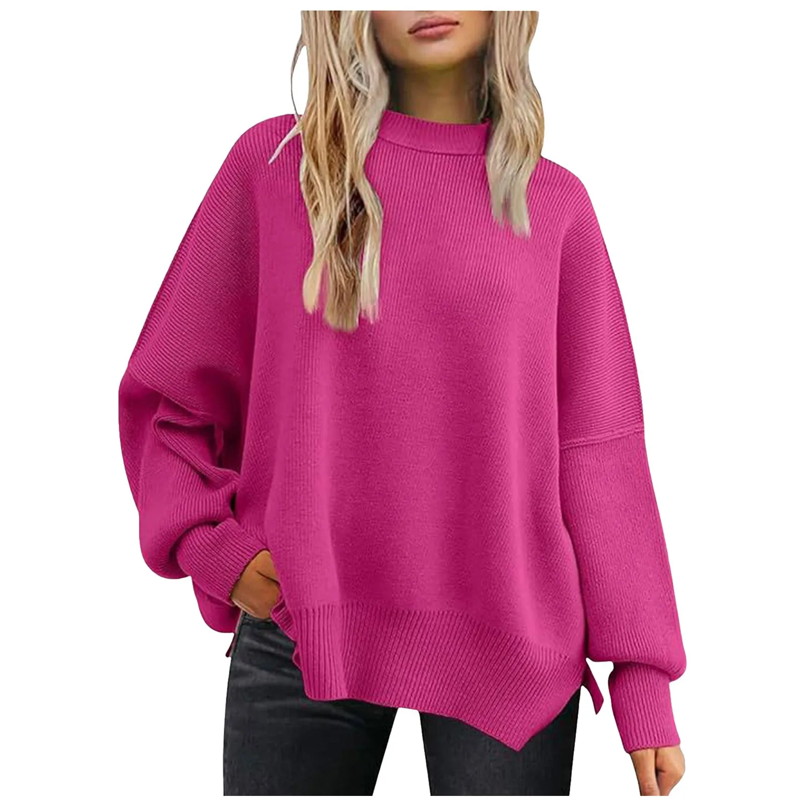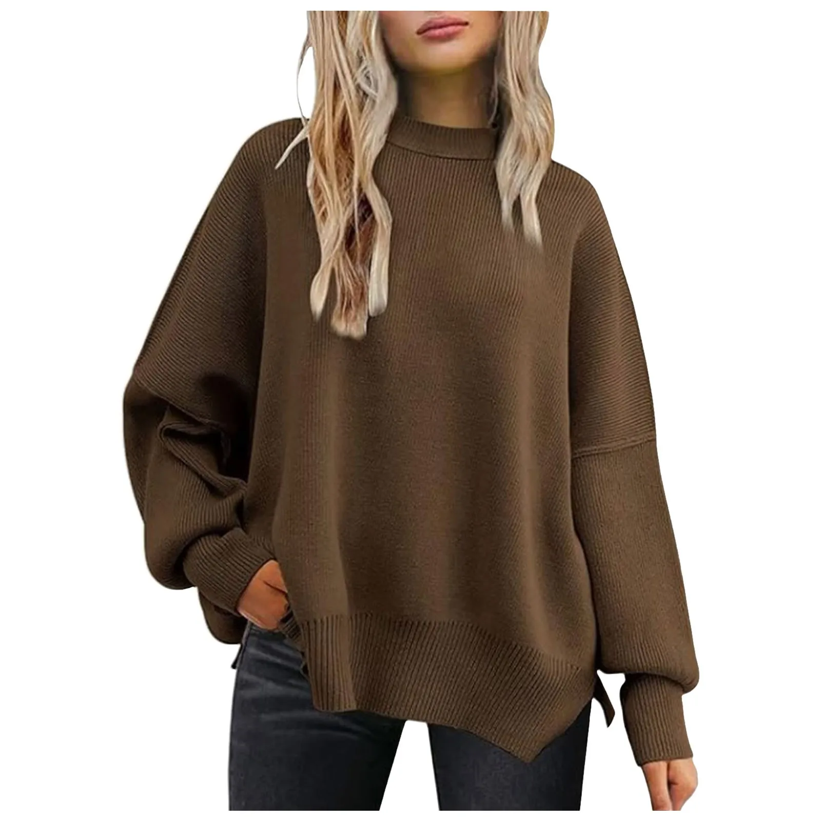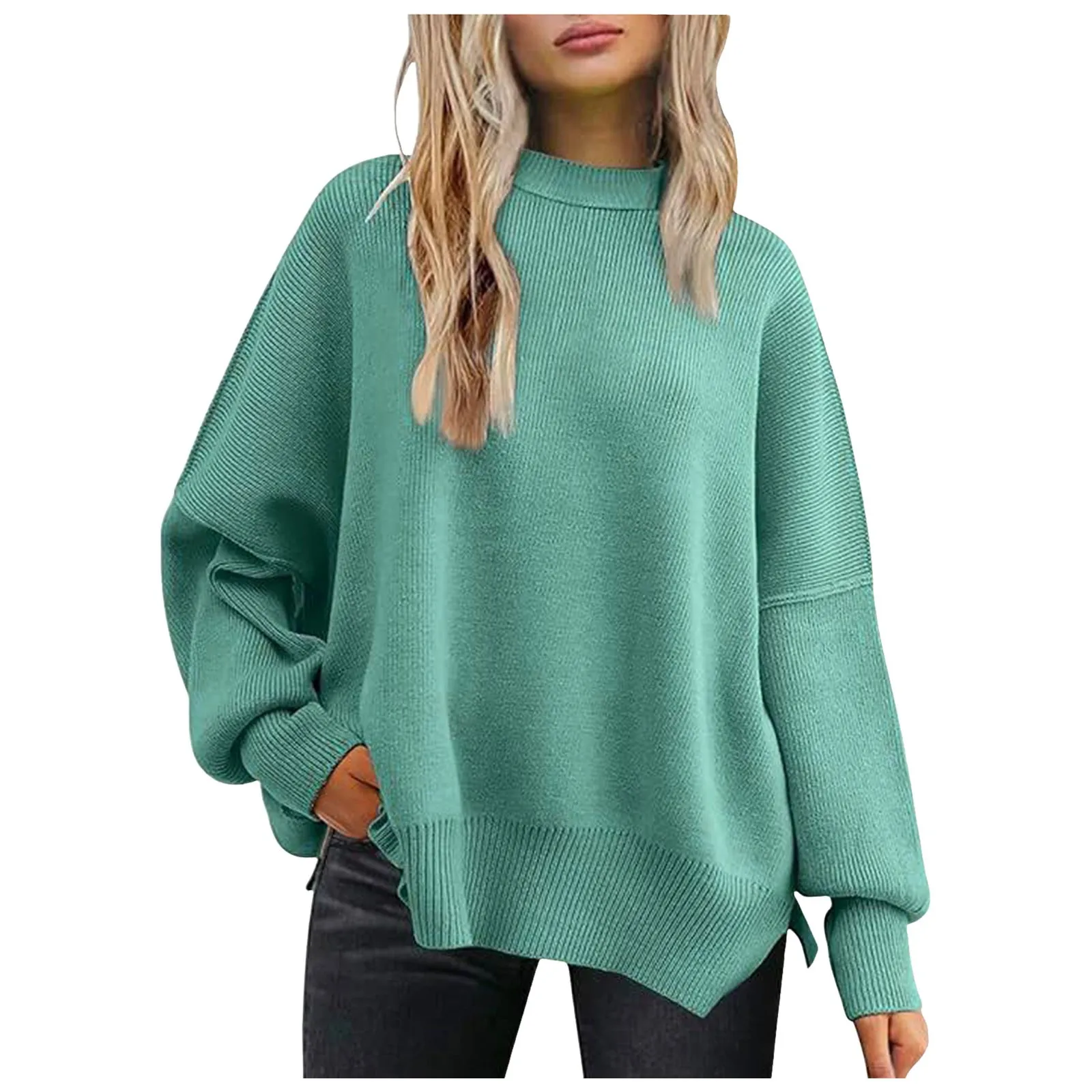 Women Crew Neck Batwing Long Sleeve Knit Side Slit Pullover