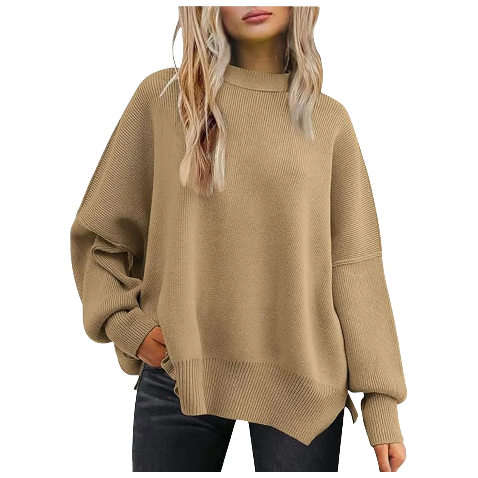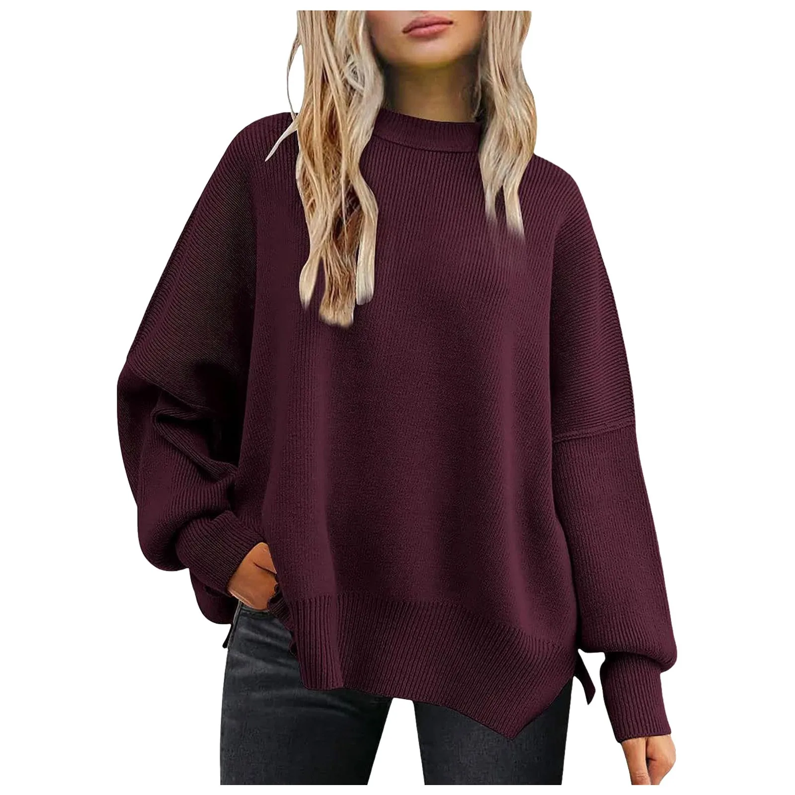 Women Crew Neck Batwing Long Sleeve Knit Side Slit Pullover