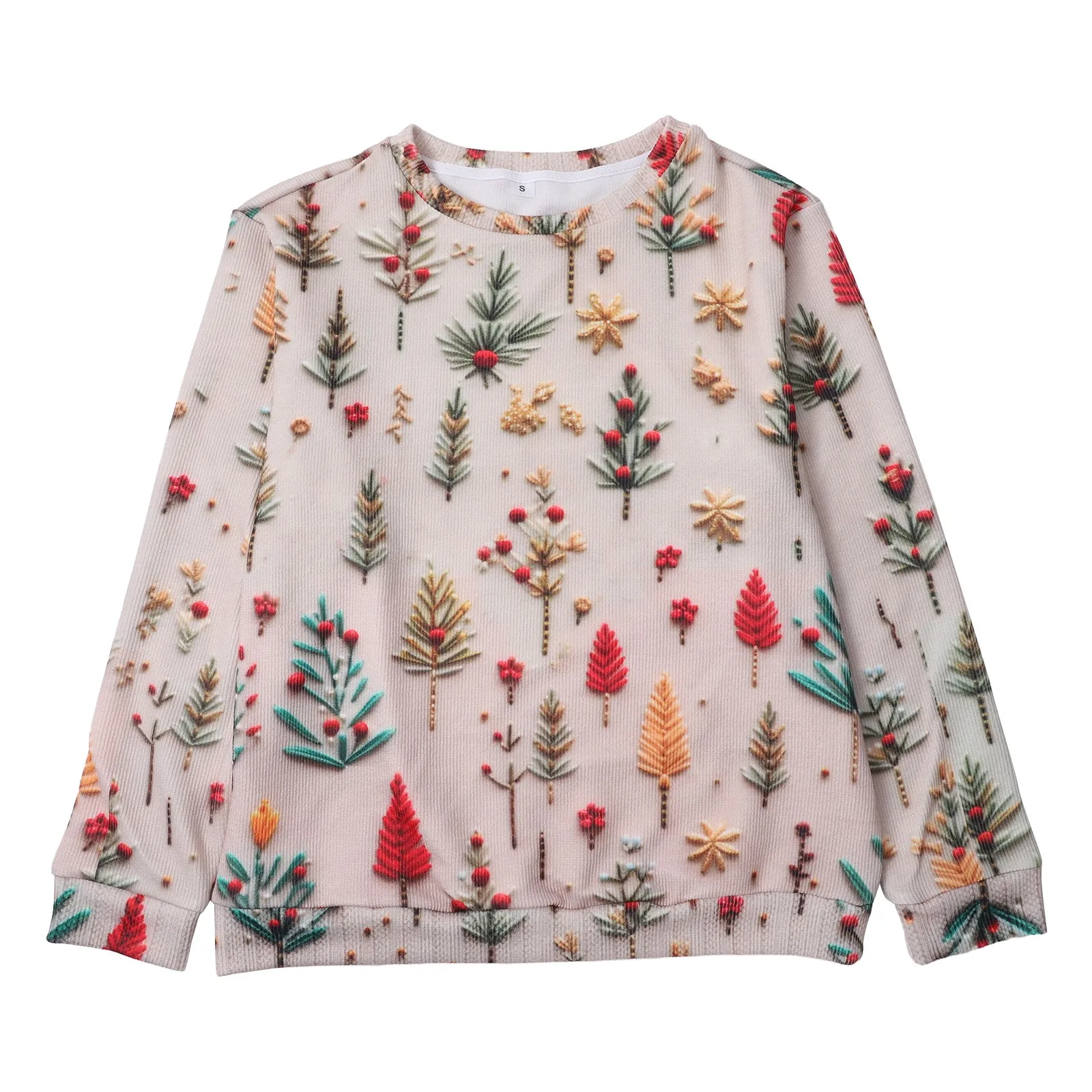 Winter 3D Christmas Tree Print Round Neck Fashion Retro Casual Printed Sweatshirt Long Sleeve Holiday Sweater Lady Jumper