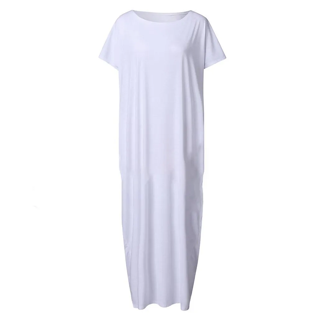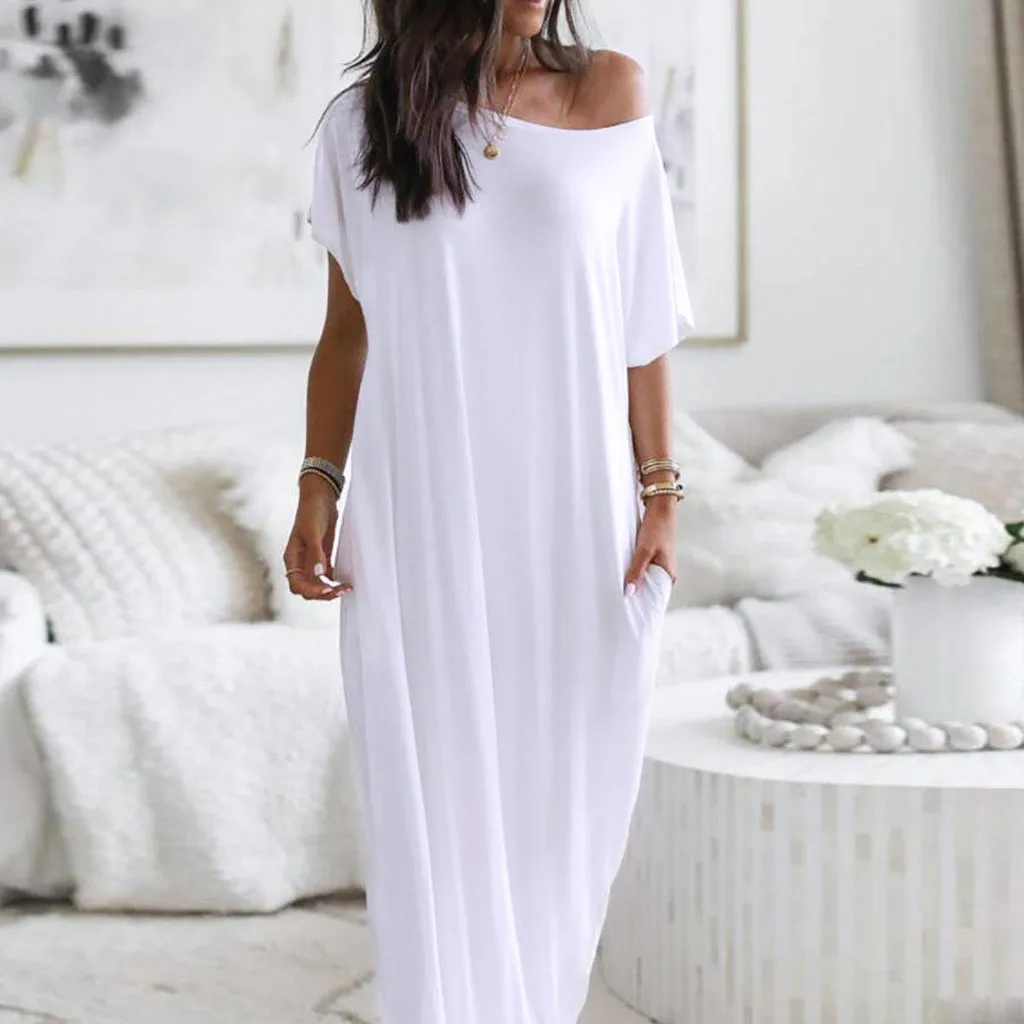 Women Summer Slash Neck Short Sleeve Pocket Long White Dress Female Casual Loose Home Dress Robe Off Shoulder T-Shirt Maxi Dress
