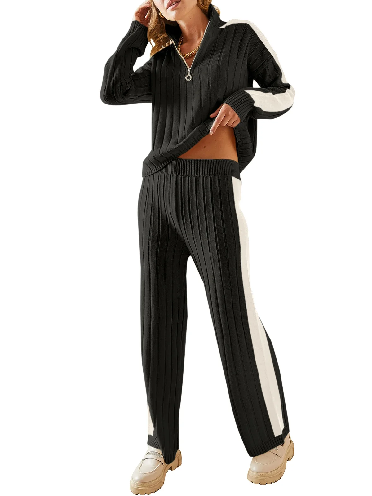Womens 2 Piece Sweater Sets 2024 Autumn/Winter Half Zip Long Sleeve Pullover Wide Leg Pants Color Block Lounge Tracksuit Outfits