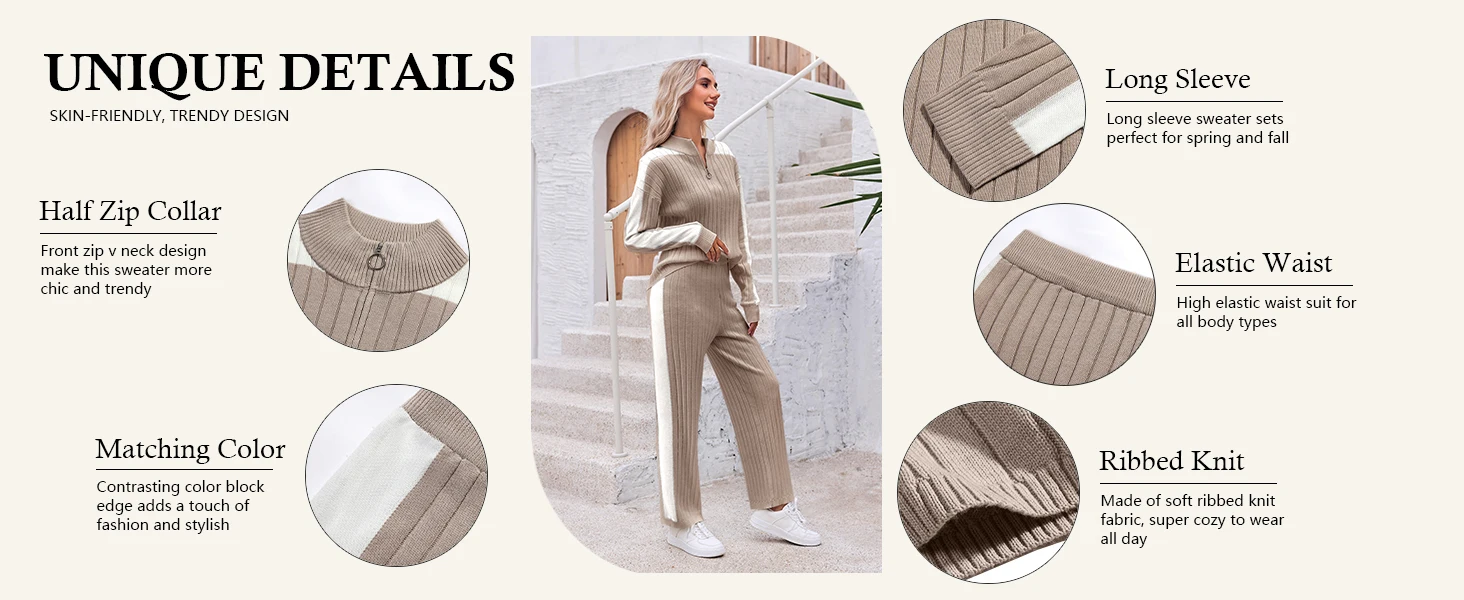 Features – Two piece sweater sets for women include long sleeve half zip v neck collared pullover sweaters, and side seam wide leg long pants with elastic waist.