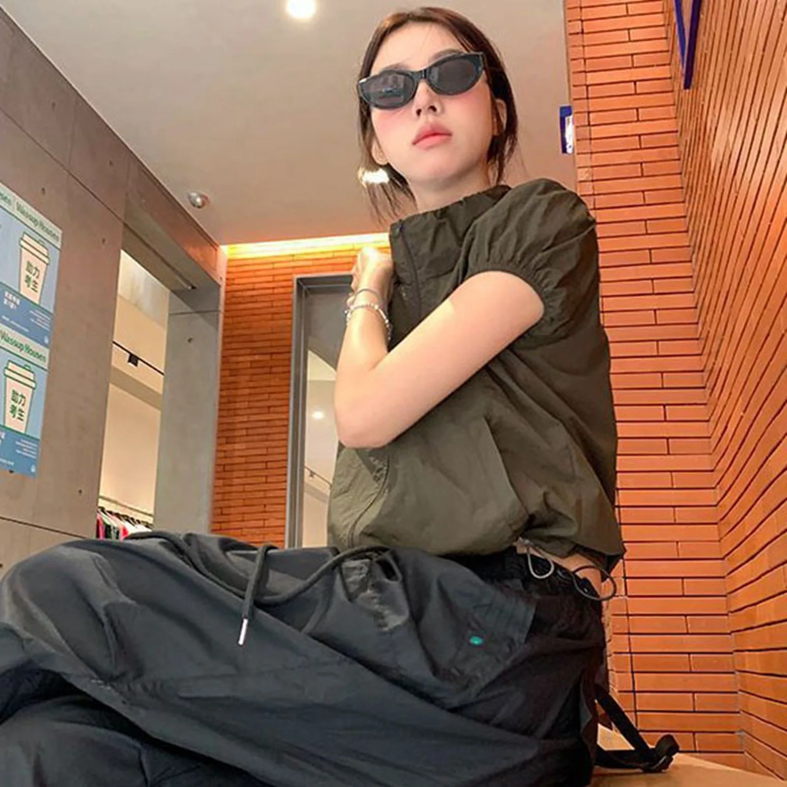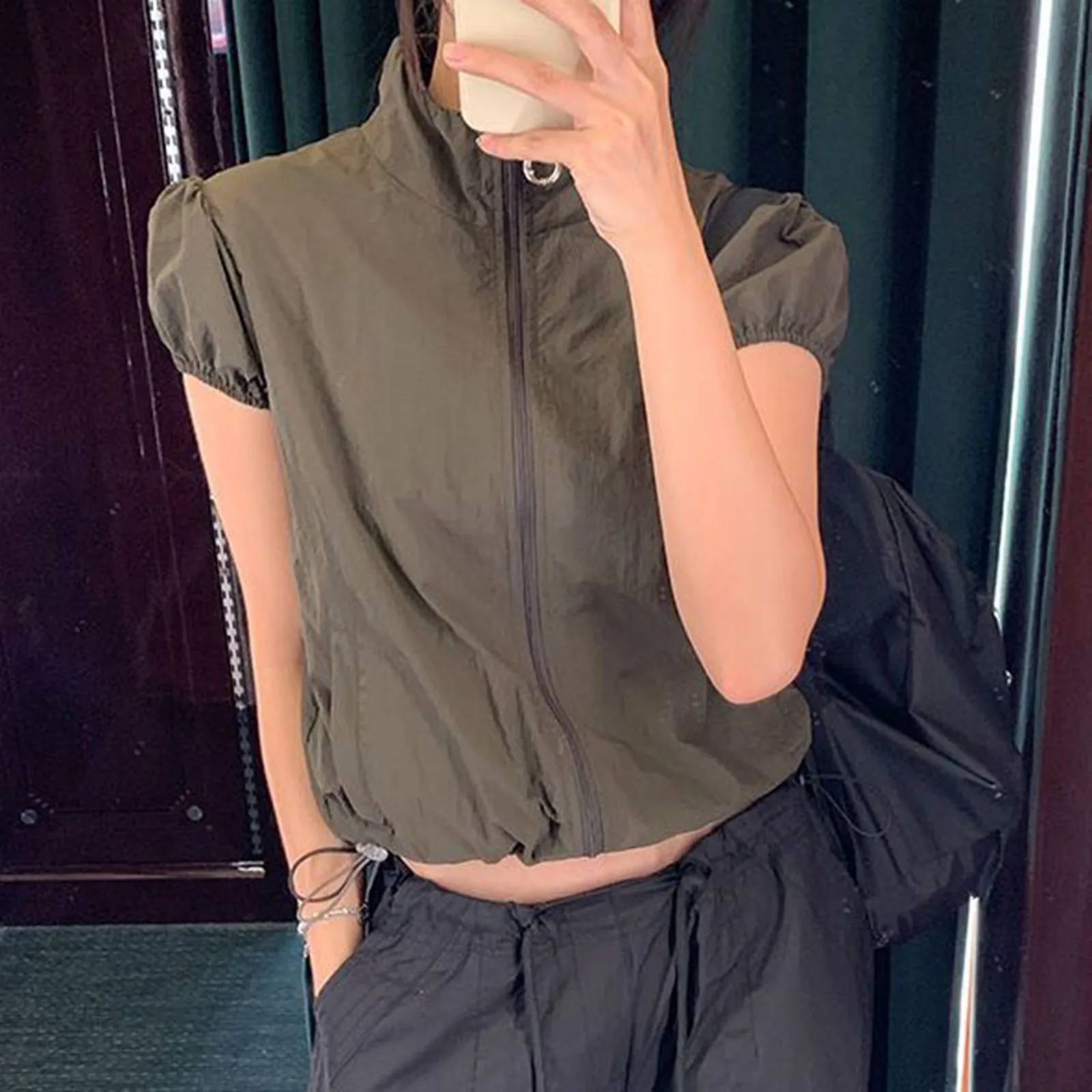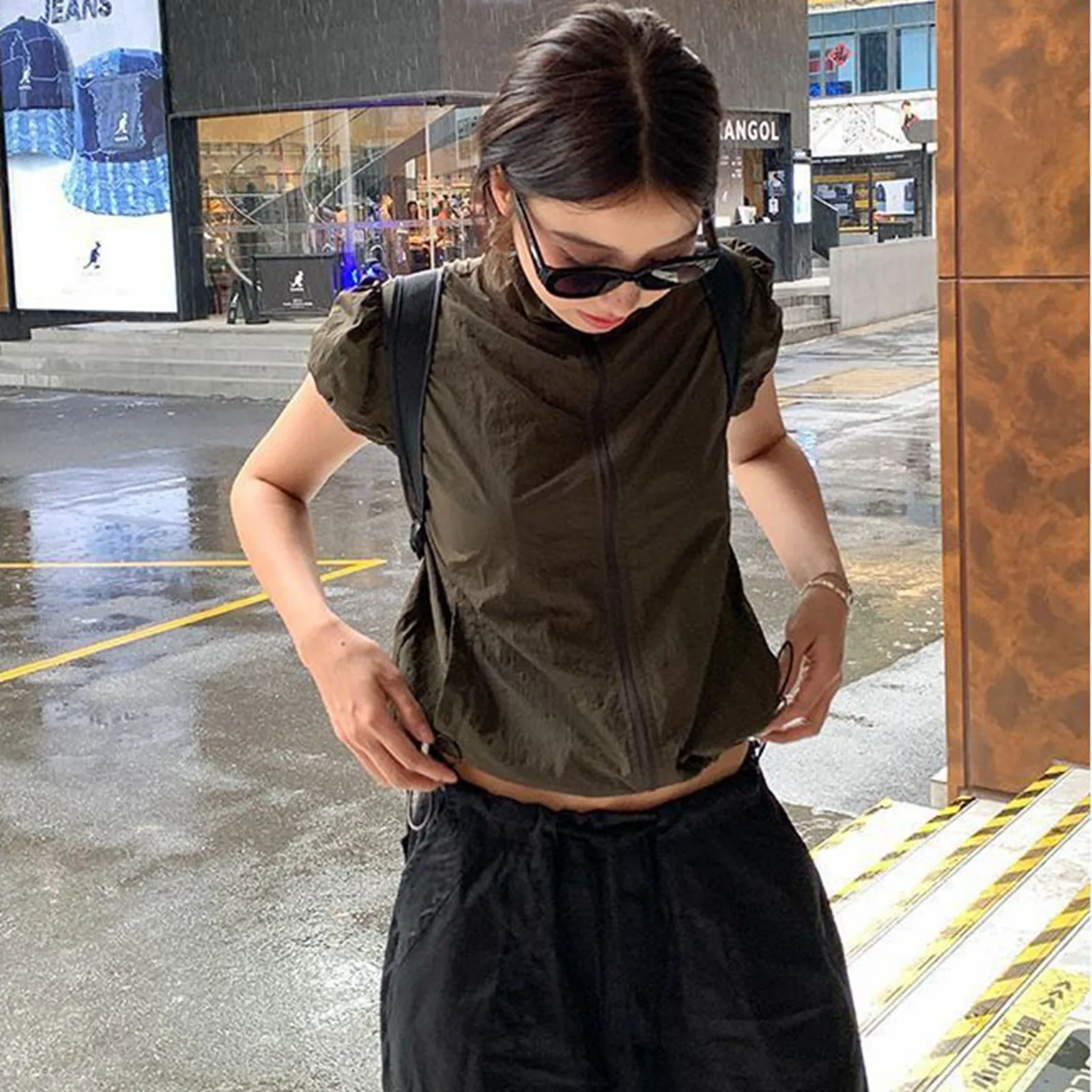 New Street Retro Top Camping Style Thin Zipper Stand Up Neck Short Sleeve Sun Short T Shirt Instagram