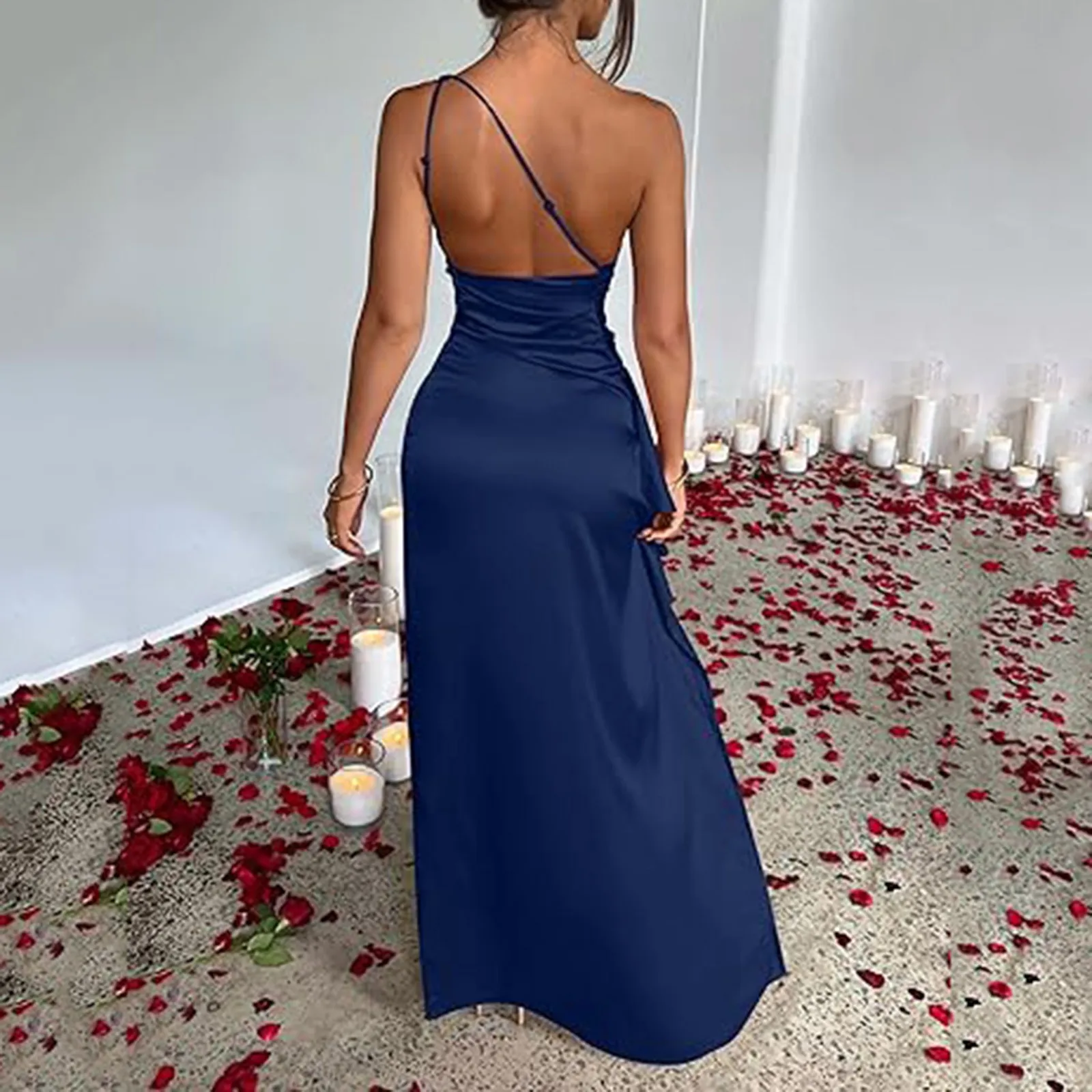 Women’s Sexy One Shoulder Satin High Split Cocktail Wedding Party Maxi Dress
